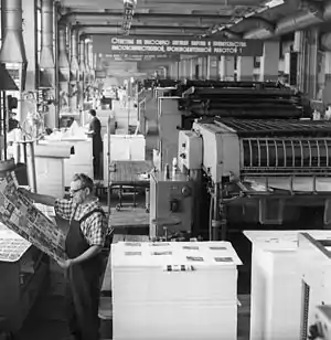 Типогра́фия (др.-греч. τύπος — оттиск и γραφή — писание) — полиграфическое производственное предприятие, на котором в общем случае осуществляется допечатная подготовка (изготовление печатных форм, клише, штампов для высечки, фотоформ), нанесение изображения на носитель (бумага, пластик, металл) — печатание тиража, а также послепечатная обработка печатной продукции (брошюровка, переплёт, ламинация, тиснение, конгрев, высечка, склейка и тому подобное)[1].