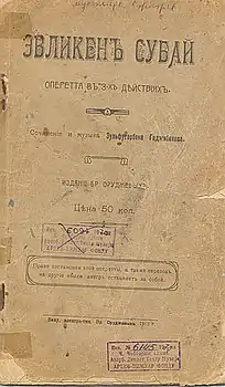 ![]() Либретто оперетты З. Гаджибекова «Женатый холостяк», изданное бр. Оруджевыми в 1915 году | |