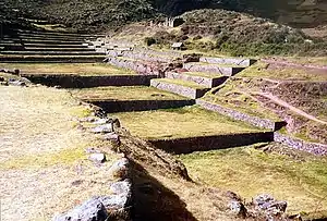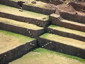 Верхнюю часть комплекса пересекает Дорога Инки, соединённая с ирригационным каналом.