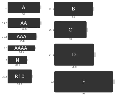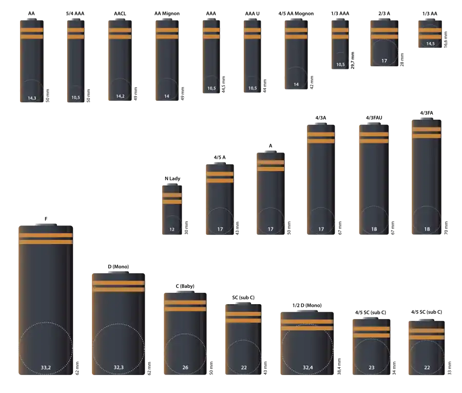 Элементы с тем же диаметром, но уменьшенной/увеличенной длиной обычно содержат в обозначении дробь, условно показывающую соотношение длины элемента к стандартной (например, «4/5 AA» — элемент с размерами 14,5×44,5 мм (тот же диаметр, но длина не 5, а 4 см) |