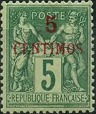 Французская почта в Османской империи (1885): 1 пиастр (Sc #1) — надпечатка на марке, имевшей оригинальный номинал в 25 сантимов. Марка погашена в Бейруте