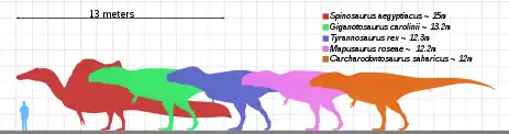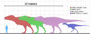До публикации 2019 года, в которой был описан Скотти, наиболее крупным экземпляром считался FMNH PR2081 по прозвищу «Сью», достигавший 12,3 метра в длину[9] и имевший высоту на уровне бедра в 4 метра[16]. Оценка массы тела этого образца в течение многих лет сильно изменялись: обычно от 5,4 тонн до 6,8 тонны[17][18][19][20], реже — более чем 7,2 тонны[21] или менее чем 4,5 тонны[22][23], самые современные же оценки равняются примерно 9,5[9] и 8,4[24][14] тоннам.