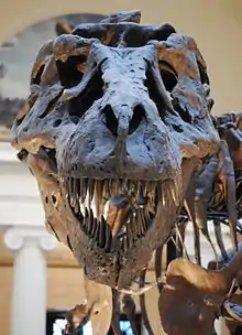 Самый большой из когда-либо найденных полных черепов тираннозавра в длину достигает примерно полутора метров[28]. Большие окна в черепе способствовали уменьшению его массы и создавали необходимое пространство для прикрепления мышц, как и у всех плотоядных динозавров. Но в других отношениях череп тираннозавра очень отличался от черепов больших теропод, не относящихся к тираннозавридам. Его задняя часть была очень широкой, но рыло было узким, благодаря чему ящер обладал высокоразвитым бинокулярным зрением[29][30]. Черепные кости были тяжёлыми. Носовая и некоторые другие кости были объединены, что предотвращало попадание чего-либо постороннего в пространство между ними. Они были пневматизированы (воздухоносны, то есть в черепе имелись околоносовые пазухи, как и у других нептичьих динозавров). Вероятно, это делало кости более гибкими и лёгкими. Эти и некоторые другие свойства, способствовавшие укреплению черепа, принадлежат к тенденции тираннозавридов к увеличению силы укуса, которая у этих ящеров с огромным преимуществом превосходила таковую у всех теропод-нетираннозаврид[31][32][33]. Конец верхней челюсти имел U-образную форму (в то время как у большинства хищников, не относящихся к тираннозавридам, он был V-образным); такая форма позволяла увеличить количество тканей и костей, которые тираннозавр мог за один укус вырвать из тела жертвы, а также усиливала давление, оказываемое передними зубами ящера[34][13].