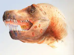 Многие учёные считают, что T. rex имел перья (по крайней мере, на отдельных частях тела), хотя прямых подтверждений этого нет[99]. Это предположение основывается на наличии перьев у некоторых родственных видов меньшего размера. Доктор Марк Норелл из Американского музея естественной истории подытожил все факты и свидетельства следующими словами: «У нас столько же свидетельств того, что T. rex был покрыт перьями, хотя бы на определённых этапах своей жизни, сколько и того, что австралопитеки, такие как Люси, были покрыты шерстью»[100].