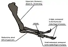 Когда тираннозавр был обнаружен, единственной известной частью его передних конечностей была плечевая кость[84]. Во впервые установленном в музее скелете, который был показан публике в 1915 году, вместо ещё не обнаруженных конечностей тираннозавра Осборн поставил более длинные, трёхпалые лапы, похожие на таковые у аллозавра[85]. Годом ранее Лоуренс Ламб описал короткие, двупалые передние лапы близкого родственника тираннозавра горгозавра[86]. Это давало сильные основания утверждать, что у тираннозавра передние конечности были похожими, однако это предположение было доказано только в 1989 году, когда были идентифицированы полные ископаемые остатки передних лап тираннозавра (экземпляр MOR 555, известный как «Уонкел рекс» — англ. «Wankel rex»)[87]. В скелете «Сью», кстати говоря, передние конечности тоже полностью сохранились[26]. Передние конечности тираннозавра чрезвычайно малы по отношению к общим размерам тела, в длину они достигают лишь одного метра, некоторые учёные вообще считают их рудиментарными органами. Но на их костях есть большие участки для прикрепления мышц, что говорит о значительной силе. Впервые эта особенность была замечена ещё в 1906 году Осборном, который предположил, что передние конечности могли использоваться для удержания полового партнёра во время спаривания[88]. Также предполагалось, что они использовались с целью помочь животному подняться из лежачего положения[81]. Другой их функцией могло быть удержание пытающейся вырваться жертвы, пока хищник убивал её своими огромными челюстями. В пользу этого говорят некоторые биомеханические признаки.
