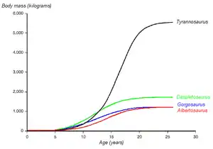 Гистологические исследования позволили определить возраст и других экземпляров. Чтобы показать зависимость массы той или иной найденной особи тираннозавра от её возраста, можно изобразить график — «кривую роста» (англ. growth curve). У тираннозавра кривая роста имеет S-образную форму, причём быстрое увеличение массы начинается около 14 лет (этому возрасту соответствует масса 1800 кг). В течение этой стремительной фазы роста тираннозавр на протяжении 4 лет набирает по 600 килограммов в год. Когда особь достигает восемнадцатилетнего возраста, её рост быстро замедляется. К примеру: у 28-летней особи по прозвищу «Сью» и 22-летней канадской особи (RTMP 81.12.1) разница в массе составляла лишь 600 килограммов[17]. Другие недавние гистологические исследования, проведённые различными учёными, подтверждают эти результаты, показывая, что стремительный рост начинает замедляться при достижении шестнадцатилетнего возраста[67]. А эти исследования, в свою очередь, подкреплены некоторыми другими, которые тем не менее показывают, что рост идёт гораздо быстрее, и за счёт него животное набирает по 1800 килограммов в год. Хотя все эти оценки значительно превышали результаты, полученные ранее, их авторы заметили, что данные результаты существенно сгладили различие между настоящими показателями роста и теми, что изначально ожидали от животного таких размеров[68]. Внезапное изменение скорости роста в конце этой «вспышки», вероятно, говорит о достижении физической зрелости — в пользу этой гипотезы говорит обнаружение медуллярной ткани в бедренной кости особи возрастом от 16 до 20 лет из Монтаны (MOR 1125, также известна как «Би-рекс», (англ. «B-rex»)). Медуллярная ткань — это костная ткань, откладывающаяся у самок птиц в полостях костей в период овуляции и служащая резервуаром кальция[69]. Наличие её у «Би-рекс» позволяет утверждать, что она была особью репродуктивного возраста[70]. Дальнейшие исследования показали, что этой особи было 18 лет[71]. У других тираннозавридов кривые роста имеют чрезвычайно похожий вид, несмотря на то, что в связи с меньшими размерами взрослых особей скорость роста у них ниже[72].