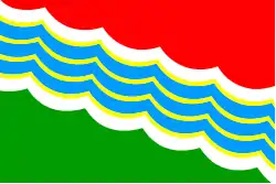 Флаг Тирасполя появился 14 октября 2002 года[15] и представляет собой прямоугольное полотнище с отношением ширины к длине 2:3, красно-зелёного цвета с диагональной полосой сине-голубого цвета на белом фоне. Сине-голубая полоса символизирует реку Днестр. Ширина диагональной полосы составляет одну треть ширины флага[16].