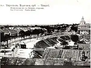 Город начала XX века занимал центральную часть современного Тирасполя. Улица Покровская (ныне 25 Октября) была основной, здесь располагались административные и торговые учреждения, дома обеспеченных горожан[29]. На северо-западной окраине размещались воинские казармы, на северо-восточной — железнодорожный вокзал. На тот момент город насчитывал 31 тысячу жителей[30].