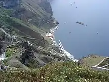 Гаванью служит Ормос-Фирон, расположенный на берегу моря, откуда ведёт лестница с 580 ступенями, которой пользуются жители и гости острова, а также животные.