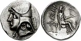 ![]() Изображение парфянского царя (возможно, Тиридата I) на монете. | |