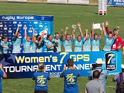 ![]() Алёна Тирон на церемонии награждения победителей этапа чемпионата Европы по регби-7 2017 года во французском Мальморе | ||||||||||||||||||||||||||||||||||