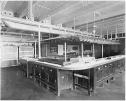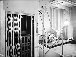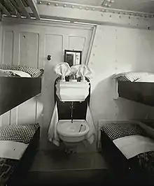 На палубе F располагались два больших кубрика, один — на 53 кочегара, другой — на 40 стюардов. Здесь же были места четырёх смазчиков и пяти почтовых клерков. В кормовой части находились кухня обеденного салона третьего класса, каюты главного механика и его помощников[64]. В носовой оконечности палубы G располагались кубрики для 15 кочегаров и 30 смазчиков. За ними по правому борту размещалось почтовое отделение, в котором сортировались почтовые отправления[65]. Пространство между переборками М и N занимали кладовые с мясом, рыбой, молоком, мороженым, фруктами, овощами, яйцами, маслом и камера разморозки. Для быстрой доставки продовольствия на кухни использовались конвейерные лифты. Основная часть продуктов хранилась в больших морозильных камерах. В роли хладагента в них выступал углекислый газ. Каждая рефрижераторная установка состояла из двух сдвоенных компрессоров. В конденсаторы закачивалась морская вода из танка на нижней палубе, охлаждая газ, сжиженный при большом давлении. Затем хладагент подавался в рубашки охлаждения различных отсеков и возвращался в компрессоры для повторного использования[66].