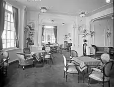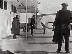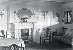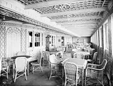 Между первой и второй дымовыми трубами находилась радиорубка и каюта радистов. Оборудование радиостанции располагалось в двух смежных помещениях: в звукоизолированной «тихой» комнате, в которой был установлен передатчик, и в радиорубке — помещении с рабочими местами радистов, различными панелями управления и приёмником[53]. Между второй и третьей трубами на высоте 3,6 м над шлюпочной палубой находилась компасная площадка, в которой располагался нактоуз с эталонным компасом. По нему корректировались все компасы на судне. Показания эталонного компаса проверялись по астрономическим наблюдениям. Все элементы конструкции площадки были выполнены из дерева и латуни, помещение освещалось масляными лампами. Эти меры предпринимались для того, чтобы магнитные и электрические поля оказывали минимальное воздействие на компас и не приводили к магнитной девиации. Когда площадка не использовалась, её закрывали брезентовым тентом[54]. Между третьей и четвёртой трубами находился небольшой променад для механиков, на правом борту, напротив резервуаров с питьевой водой, располагался их курительный салон[55].