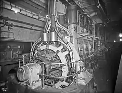 Водяной пар из котлов по двум главным паровым магистралям диаметром 53 см поступал в паросепараторы, где от него отделялись твёрдые частицы и капельная влага[72]. Затем пар при температуре 201 °С поступал под давлением 14,6 атм во второй цилиндр паровой машины диаметром 1,37 м. После расширения пара в цилиндре происходила его декомпрессия. Имея на выходе давление 5,3 атм и температуру 161 °С, пар направлялся в третий цилиндр среднего давления диаметром 2,13 м. Здесь процесс повторялся, и пар под давлением в 1,6 атм подавался в два цилиндра (первый и четвёртый) низкого давления диаметрами по 2,46 м. При частоте оборотов в минуту, равной 75, одна машина потребляла до 2,8 т пара за тот же промежуток времени[73]. На выходе из паровых машин пар имел давление 0,61 атм и температуру 87 °С[74].