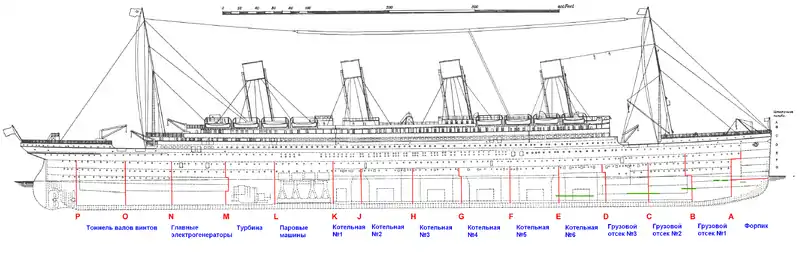 Корпус «Титаника» был разделён на 16 водонепроницаемых отсеков пятнадцатью переборками, построенными поперёк корабля. Переборки обозначались от носа к корме латинскими буквами от A до P (исключая I). Они поднимались от второго дна и проходили через две или три палубы (переборки A, B, K, L, M, N, O и P доходили в высоту до палубы D, остальные — до E, то есть выше ватерлинии на 3,4 м). Переборки придавали корпусу поперечную прочность. Они были собраны из стальных листов, соединённых внахлёст заклёпками. Для достижения абсолютной герметичности швы заделывались смолой. Толщина листов в нижней части переборки составляла 142 мм, в верхней — 76 мм[43]. Первые две переборки в носовой и последняя в кормовой части были сплошными. Во всех остальных имелись герметичные двери, позволявшие команде и пассажирам передвигаться между отсеками[44].