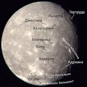 - Croft S. K. New geological maps of Uranian satellites Titania, Oberon, Umbriel and Miranda (англ.) // Proceeding of Lunar and Planetary Sciences. — Houston: Lunar and Planetary Sciences Institute, 1989. — Vol. 20. — P. 205C.