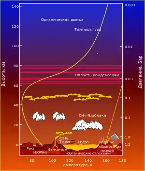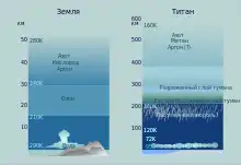 Граница атмосферы Титана находится примерно в 10 раз выше, чем на Земле[25][26]. Граница тропосферы располагается на высоте 35 км. До высоты 50 км простирается обширная тропопауза, где температура остаётся практически постоянной, а затем температура начинает расти. Минимальная температура около поверхности составляет −180 °C, при увеличении высоты температура постепенно повышается и на расстоянии 500 км от поверхности достигает −121 °C. Ионосфера Титана имеет более сложную структуру, чем земная, её основная часть располагается на высоте 1200 км. Неожиданностью стало существование на Титане второго, нижнего слоя ионосферы, лежащего между 40 и 140 км (максимум электропроводности на высоте 60 км)[25].