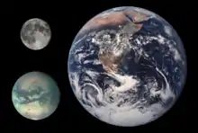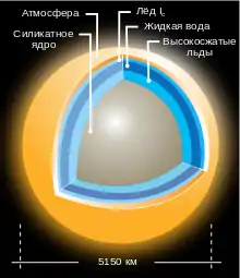 Тита́н (др.-греч. Τιτάν) — крупнейший спутник Сатурна, второй по величине спутник в Солнечной системе (после спутника Юпитера Ганимеда), является единственным, кроме Земли, телом в Солнечной системе, для которого доказано стабильное существование жидкости на поверхности[7][8], и единственным спутником планеты, обладающим плотной атмосферой.