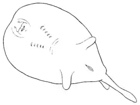 Передние края крупных и широких брюшных плавников образуют отростки, подобные конечностям. Задние края срастаются с краями грудных плавников, являясь частью диска. В месте соединения плавников с хвостом выемка отсутствует. У взрослых самцов имеются цилиндрические птеригоподии, концы которых выступают из-под диска. На уровне соединения диска с туловищем находится основание единственного спинного плавника, имеющего закруглённые края. По бокам короткого и толстого хвоста расположены еле заметные складки кожи, хвост оканчивается почти круглым хвостовым плавником. Кожа лишена чешуи. Окраска дорсальной поверхности ровного коричневого цвета, края диска и вентральная поверхность более светлого оттенка. Область вокруг рта и ноздрей, а также вентральная поверхность отростков, образованных брюшными плавниками, окрашена в белый цвет. Максимальная зарегистрированная длина 36 см[5].