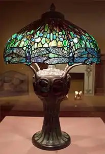 С начала 1880-х годов Тиффани переключился на дизайн стекла. Постоянно экспериментируя, дизайнер разработал новый вид стекла — «Фавриль». На Всемирной выставке 1893 года в Чикаго работы Тиффани были восторженно приняты публикой. С середины 1880-х годов основанная им дизайнерская фирма производила витражи на религиозные сюжеты по заказам церквей и храмов. Из кусочков стекла, оставшихся после нарезки отдельных элементов витражей, компания стала производить абажуры. К концу XIX века эти изделия приобрели большую популярность, и фирма заняла лидирующее положение на рынке.