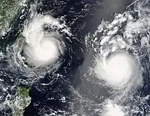 | Камчатка. Авачинская бухта | Извержение вулкана на острове Савайи (Самоа) в 1905 году | Сводная схема маршрутов тихоокеанских тайфунов в 1980—2005 годы | Тропические циклоны Саомай (справа) и Бопха, 8 августа 2006 года |