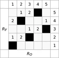 ![]() Раппорт полотняного переплетения | ![]() Полотняное переплетение. RУ — раппорт по утку, RО — раппорт по основе |