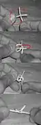 Ввести ходовой конец одной нити в колы́шку, завязанную на другой нити. Обнести сзади ходовой конец одной нити, вернуть ходовой конец другой нити под колышку обратным ходом и затянуть узел.[18][19]