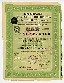 Товарищество нефтяного производства Г. М. Лианозова сыновей наряду с компаниями Бранобель и Бакинское нефтяное общество считалось одним из «трех китов» российской нефтедобывающей промышленности начала XX в[1]. Устав Товарищества нефтяного производства сыновей Г.М. Лианозова был Высочайше утвержден 23 октября 1907 г.[2], вскоре после смерти самого Георгия Мартыновича Лианозова – известного российского предпринимателя армянского происхождения, потомственного почетного гражданина, действительного статского советника, купца 1-й гильдии, основателя и председателя «Русского нефтепромышленного общества». За годы своей деятельности вплоть до национализации в начале 20-х гг. Товарищество активно приобретало новые участки нефтедобычи на территории Бакинского нефтегазоосного района, наращивало масштабы операций по продаже нефтяных продуктов за границу, увеличивало основной капитал и осуществляло дополнительные эмиссии собственных ценных бумаг.