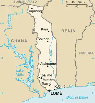 Того (официально Тоголе́зская Респу́блика; фр. République togolaise) — государство в Западной Африке, граничащее с Ганой на западе, Бенином на востоке и Буркина-Фасо на севере. На юге страна владеет небольшой частью побережья Гвинейского залива, на которой расположена столица страны Ломе.