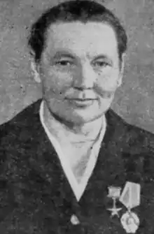 - Была также награждена медалями, в числе которых «За доблестный труд в Великой Отечественной войне 1941—1945 гг.» (1946), «За трудовое отличие» (1949) и «За трудовую доблесть» (1955); удостоена ведомственного знака отличия «Отличник социалистического соревнования цветной металлургии СССР» (1957).[1]