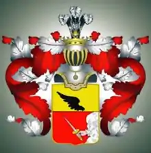 В щите разделённом горизонтально на две части, в верхней в золотом поле изображено орлиное чёрное Крыло. В нижней части в красном поле выходящая из Облаков Рука, держащая серебряную Шпагу.