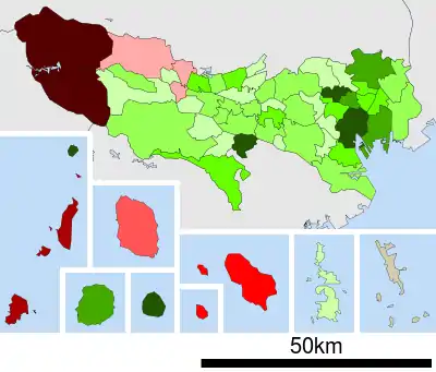 Токио имеет много отдалённых островов, один из которых удалён на 1850 км от центральной части Токио. Из-за большого расстояния от административной штаб-квартиры столичного правительства в Синдзюку острова управляются администрацией округов Токио.