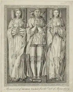 ![]() Надгробная плита в церкви Шрусбери с изображение Джорджа Толбота, 4-го графа Шрусбери (в центре), с двумя женами: Энн Гастингс и Элизабет Уолден (по бокам) | |