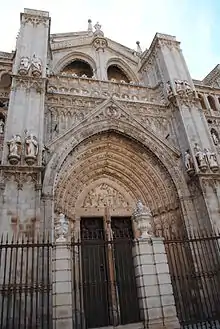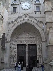 Главный фасад создан в XV веке и незначительно перестроен в XVIII. Он имеет три портала — главный портал, расположенный в центре, носит название «Пуэрта-дель-Пердон» (Ворота прощения). Название связано с некогда существовавшим поверьем, что каждый кающийся, прошедший этими воротами, получает прощение грехов[9]. Два боковых портала этой части фасада называются Ворота Страшного суда (справа) и Ворота Ада (слева).