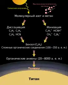 Теоретическая модель объясняет формирование толинов диссоциацией и ионизацией молекулярного азота и метана энергетичными частицами и солнечным излучением, формированием этилена, этана, ацетилена, цианистого водорода и других маленьких простых молекул и маленьких положительных ионов, дальнейшим формированием бензола и других органических молекул, их полимеризацией и формированием аэрозоля более тяжёлых молекул, которые сгущаются и выносятся на планетарную поверхность[30].