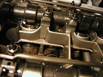 Клапанный механизм: распредвал расположен справа снизу, а толкатели находятся над с ним