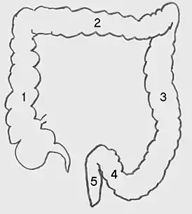![]() 1 — слепая кишка с червеобразным отростком и восходящая ободочная кишка; 2 — поперечная ободочная кишка; 3 — нисходящая ободочная кишка; 4 — сигмовидная кишка; 5 — прямая кишка. | |