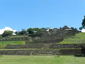 Поле для игры в мяч № 1. Большее из двух полей для игры в мяч в Тонине, имеет размеры 75 на 30 метров. Поле было построено в 699 году по приказу правителя Кинич-Бакаль-Чака, чтобы увековечить победу над другим городом майя — Паленке. Помимо привычных для стадионов майя колец для мячей, боковые стенки поля украшены скульптурами, изображающими связанных коленопреклоненных пленников — подданных правителя Паленке.