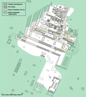 Всего на Главной площади Тонины и на семи платформах акрополя расположено более 30 храмов, дворцов и других построек. Некоторые из них хорошо сохранилась, вплоть до крыш (например, дворец Цветочного трона) и гипсовой лепнины на стенах. Другие были полностью разрушены временем и от них остались только каменные фундаменты-платформы. Так как исследование комплекса началось сравнительно недавно, у некоторых зданий пока нет общепринятых названий.