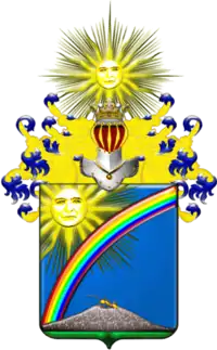 В лазурном поле радуга в перевязь влево, сопровождаемая в правом верхнем углу щита выходящим золотым с лицом солнцем, а в оконечности щита — серебряным муравейником, увенчанным золотым муравьём.