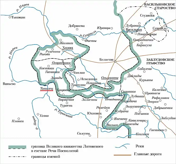 С середины XV века западные земли Чёрной Руси, граничащие с польской Мазовией, активно заселяются поляками (ляхами) и оттого именуются Подляшьем. При создании Речи Посполитой в 1569 году Южное Подляшье с городом Бельском передаётся Польскому королевству, а Северное с Белостоком остаётся в пределах Великого княжества Литовского, в составе Трокского воеводства.[4] В 1645 году, после смерти бездетного владельца Белостока, сам город отходит к Польше. Но его окрестности, в их числе и Топилец, остаются в составе Литвы.