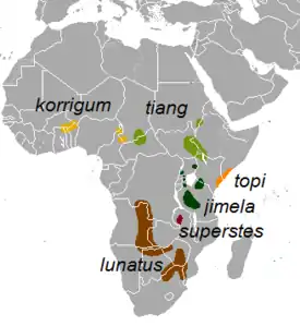 - Damaliscus korrigum — северные подвиды (топи, корригум, джимела. Тианг подвидом не признаётся).
