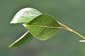 Почки крупные, остроконические, с тёмно-бурыми верхушками, почти не клейкие. Листья яйцевидные, длиной 8—15 см, шириной 5—7 см, с длинной вершиной, сверху светло-зелёные и блестящие, снизу ещё светлее и матовые.