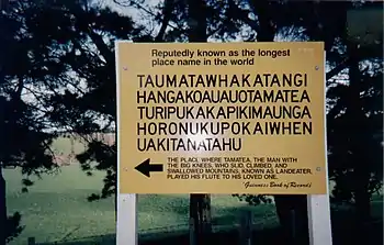 В топонимии Новой Зеландии можно выделить два основных пласта: коренной (маорийский) и европейский. По оценке В. А. Жучкевича, удельный вес коренных (маорийских) названий в топонимии Новой Зеландии значительно меньше по сравнению, например, с удельным весом коренной топонимии Австралии, в стране преобладают топонимы английского происхождения[10]. Маорийские топонимы, характеризующие природные особенности объектов, однообразны и отличаются небольшим количеством языковых средств, применяемых для образования собственных имён. Но «мемориальные» названия разнообразны, многие из них очень сложны и передают краткое изложение событий, происходивших в том или ином месте (см., например, Тауматафакатангихангакоауауотаматеатурипукакапикимаунгахоронукупокаифенуакитанатаху[11]).