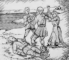 ![]() Торгерд Брак разнимает Эгиля и его отца Скаллагрима, возле мертвого Торда Гранасона | |