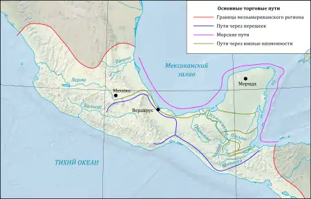 Майя торговали со всей Мезоамерикой — от Западной Мексики до Панамы и даже Колумбии, а в их городах были найдены предметы с побережий обоих океанов[2].