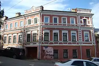 Фасады дома с литерой «Б» выходят на Зеленский съезд и ул. Рождественскую. Главный выход с крыльцом находится в угловой части здания, которую украшает кованый аттик. Окна расположены парами, украшены замковым камнем и зубчиками на втором этаже. На первом этаже ставни металлические. Этот ритм нарушается окнами средней части фасада, которые расположены поодиночке.[2]