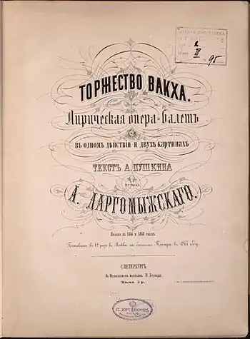 - Даргомыжский А.С. Торжество Вакха лирическая опера-балет в одном действии и двух картинах. — С.Петербург: В Музыкальном магазине М. Бернарда, 1867. — 148 с.