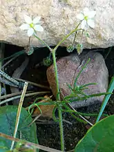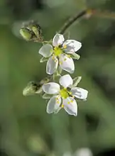 Соцветие — дихазий, каждая из веточек которого является кистевидным монохазием, безлистное. Цветоножки 1—3 см длиной, 1,7—2,2 мм шириной, яйцевидные, на верхушке туповатые, с белоплёнчатой каймой. Венчик и чашечка пятичленные. Чашелистики (3-4 мм длиной) яйцевидные, несросшиеся, железистоопушённые. Лепестки 3,5—4,5 мм длиной, 2—2,2 мм шириной, эллиптические, цельные, белые, немного длиннее чашечки. Тычинок 10, реже 5-8; столбиков 5 они короткие.