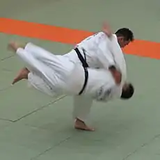 - Маэ укэми (яп. 前受け身) / Дзэнпо укэми (яп. 前方受身) — падение вперёд.[12] Может выполняться как в форме довольно жёсткого падения с отхлопом рукой и/или ногами, так и вращающимся движением перекатом. Есть тонкости между различными перекатами вперёд, но основной принцип остаётся неизменным: находясь в процессе падения вперёд, укэ способен и предпочтёт совершить перекат, таким образом избегая вероятных травм и поверждений.[13]